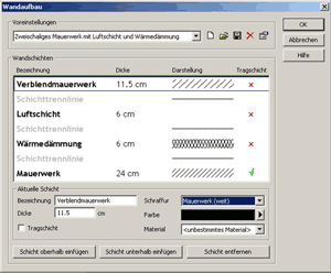 ArCon +2005 ermöglicht die Eingabe von mehrschaligen Wandaufbauten. Es