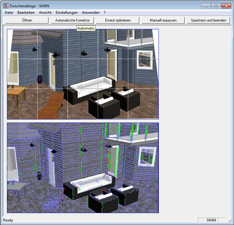 Sicherlich kennen Sie den Effekt der stürzenden Linien aus dem Bereich der Architekturfotografie. Hierbei werden die Kanten eines Motivs schräg und nicht senkrecht wiedergegeben, da Objekt- und Projektionsfläche nicht parallel zueinander liegen. Um den Effekt der stürzenden Linien direkt in ArCon zu vermeiden, haben wir die Ansteuerung der Software ShiftN von Dr. Marcus Hebel in ArCon +2014 integriert. Die Korrektur kann sowohl bei der 3D-Ansicht, als auch im Anschluss an eine Bildberechnung automatisiert oder manuell erfolgen. | |