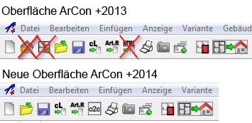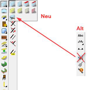 In der Version +2014 wurden einige wenige Änderungen an der Oberfläche vorgenommen, um diese ergonomischer zu gestalten bzw. wenig genutzte Funktionen auszublenden und Platz für die neue Varianten-Auswahl zu schaffen. Änderungen in der horizontalen Leiste  Änderungen in der Was - Leiste Die Funktion zum Bearbeiten von Wänden wurde unter dem Fly-Out-Menü "Wände" platziert.  | |